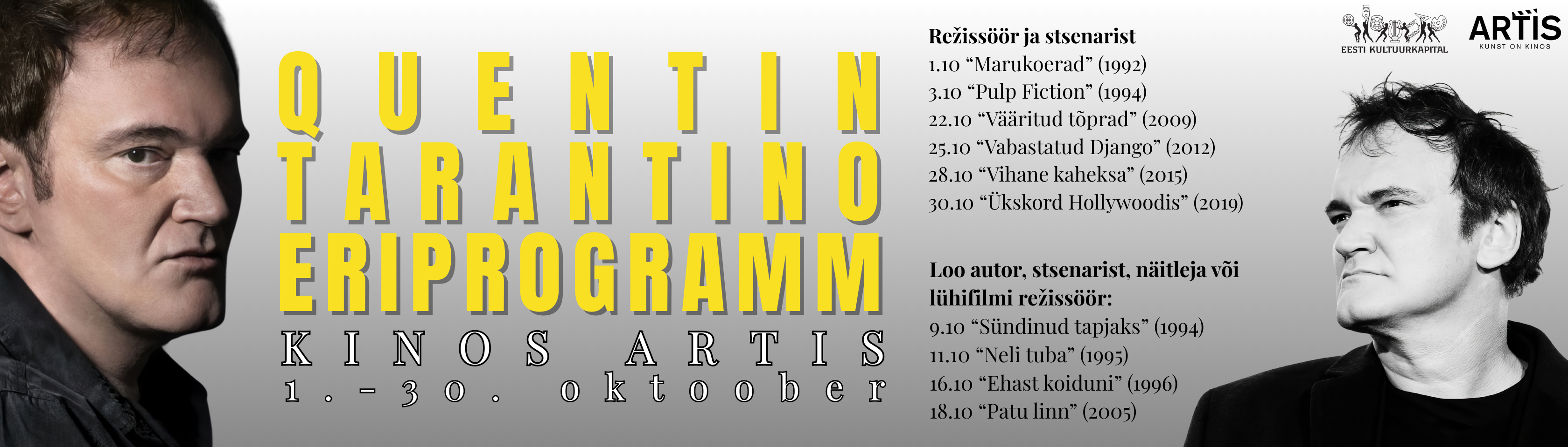 Kino Artis toob terve oktoobrikuu vältel ekraanile valiku filme, kus Tarantino on olnud režissöör, stsenarist või näitleja. See on võimalus kogeda tema unikaalset stiili suurel ekraanil – täis teravat dialoogi, popkultuuri viiteid ja mälestusväärseid tegelasi.